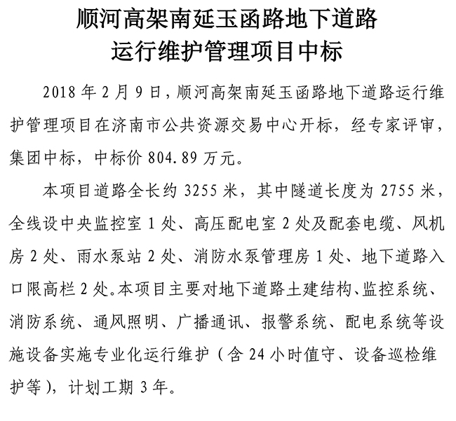 順河高架南延玉函路地下道路 運行維護管理項目中標