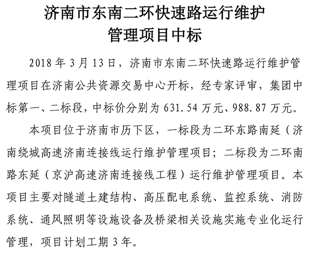 濟南市東南二環快速路運行維護管理項目中標